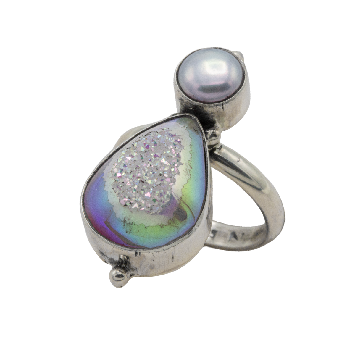 2 Stone Drusy and Fresh Water Pearl Ring; size 8.