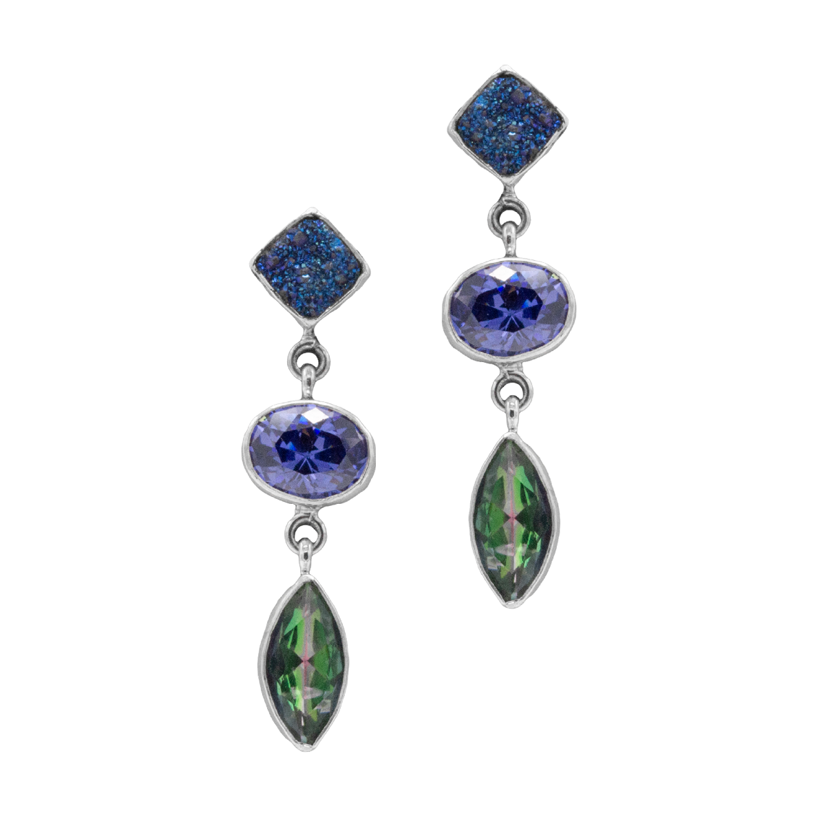 3 Stone Fresh Water Pearl, Drusy and CZ Earrings; 1-1/2″ long.