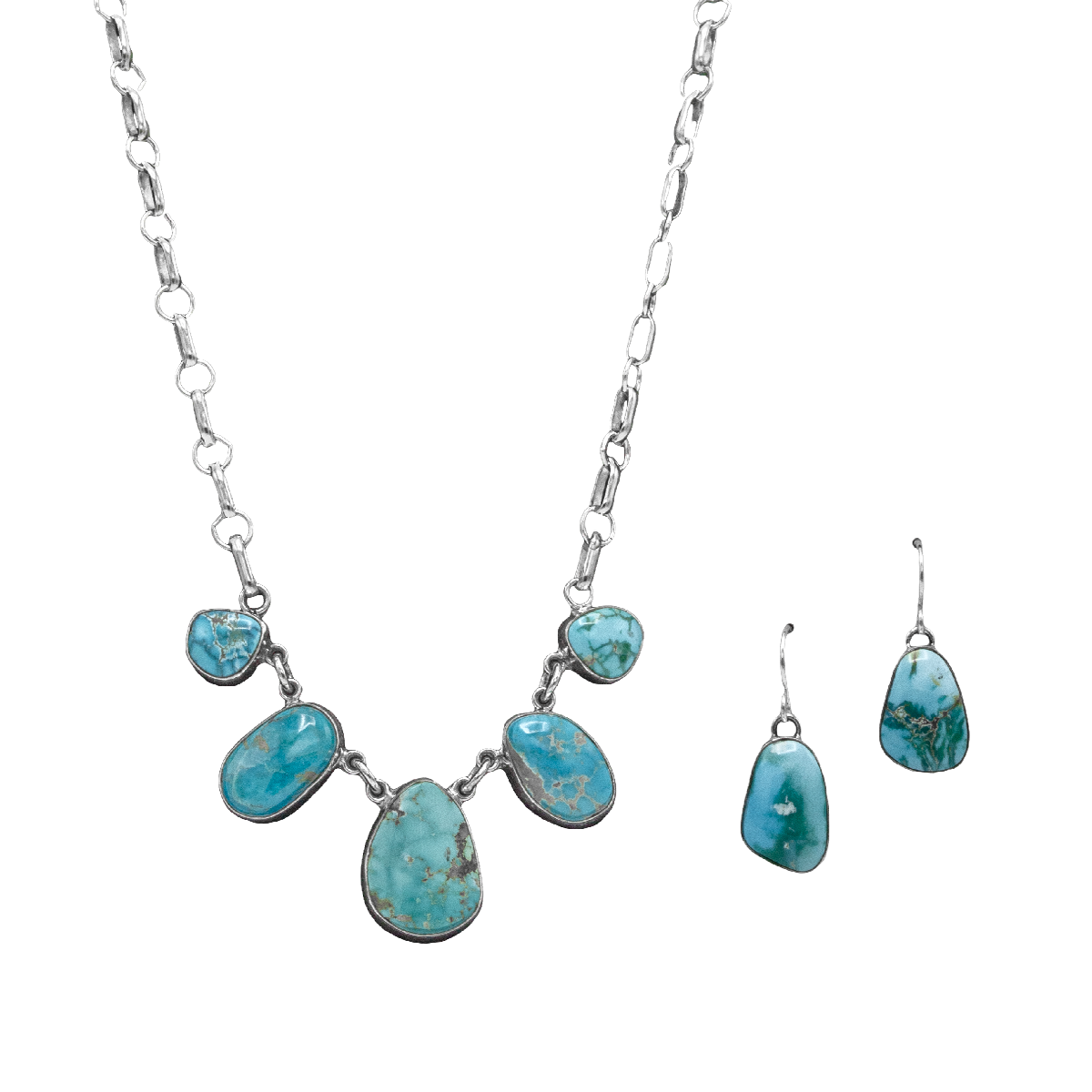 5 Stone Royston Turquoise Necklace and Earrings Set. Necklace is 18″ in length and earrings are 1″ long.