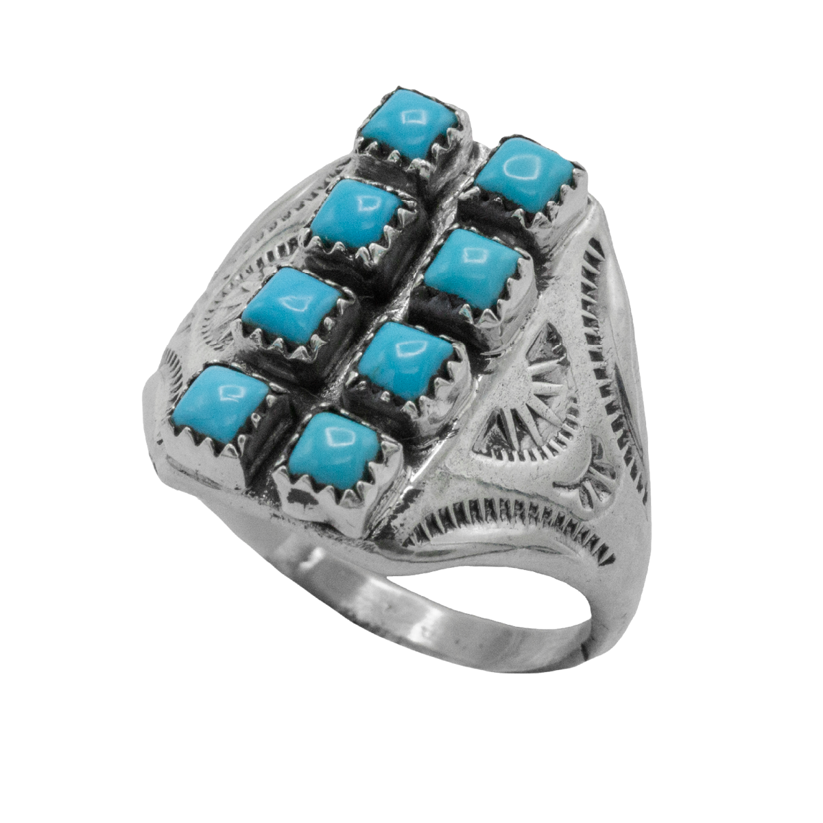 8 Stone Turquoise ring with stamped silver design; size 14.