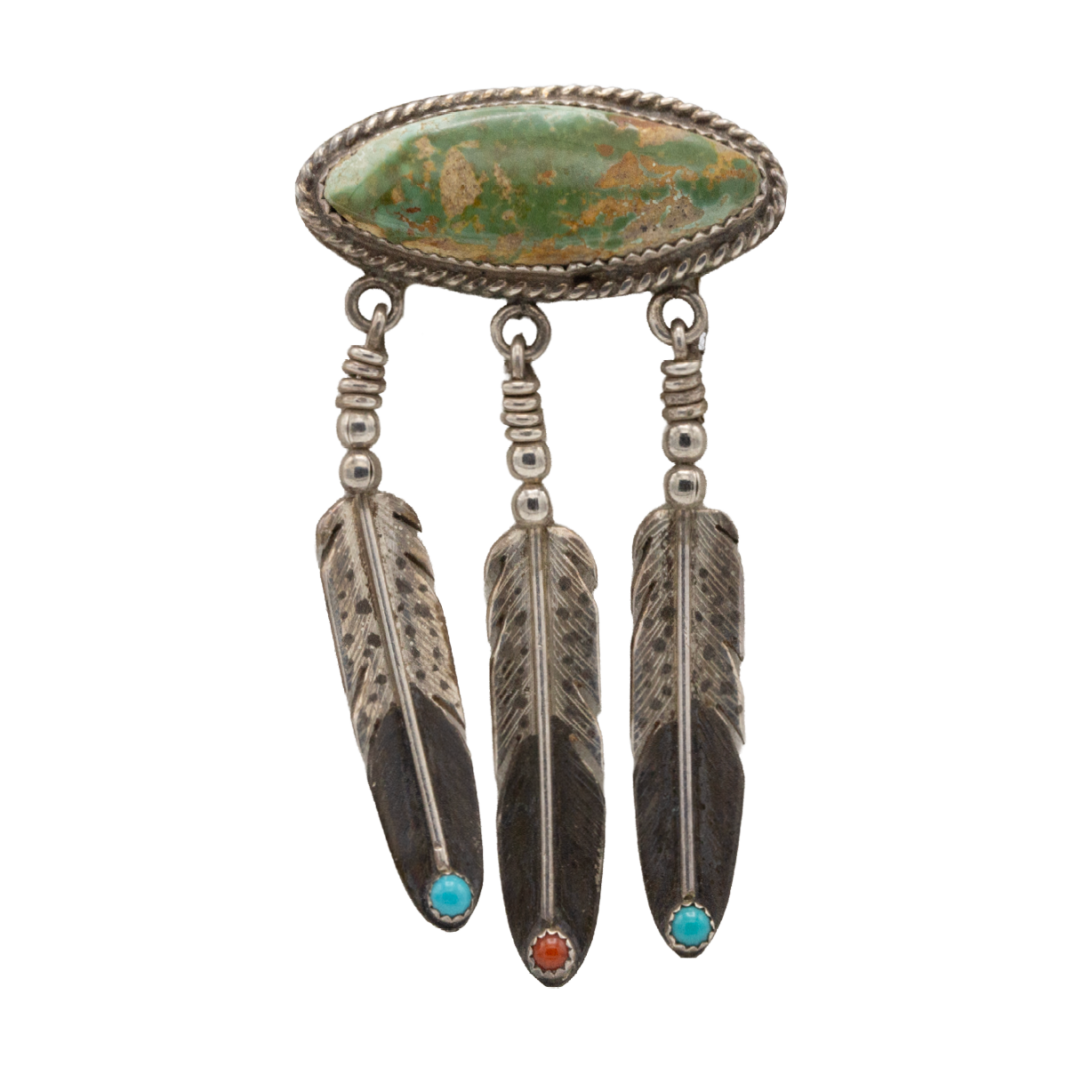 Sterling Silver Feather Pin with Turquoise Stone; 2-1/2″ long.
