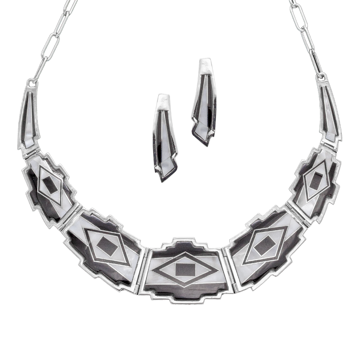 Inlay Jet and Mother of Pearl Set; necklace is 16″ in length and earrings are 1-1/2″ long.