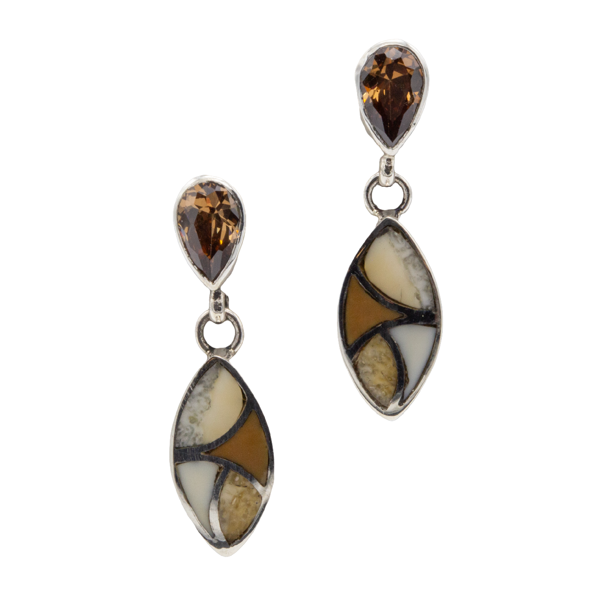 Inlay Smoky Quartz and Ivory Earrings; 1″ long.