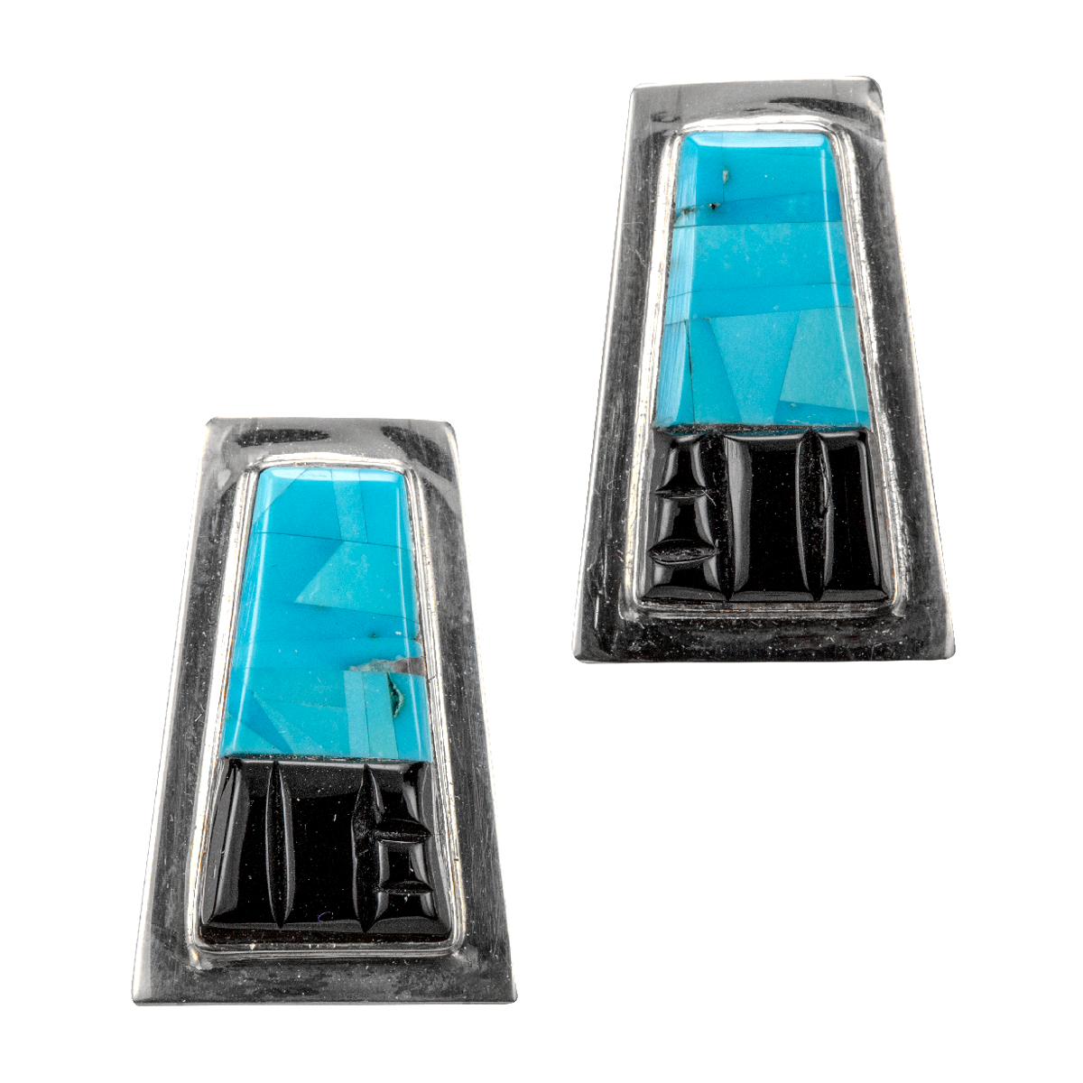 Jet and Sleeping Beauty Turquoise Inlay Earring. 1″ long.