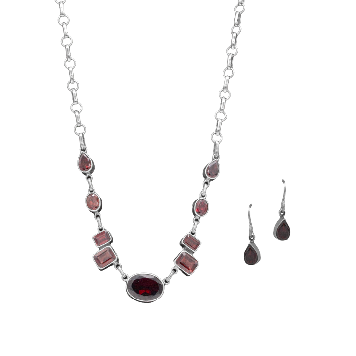 Multi-stone Faceted Garnet Set; necklace is 18″ in length and earrings are 1″ long.