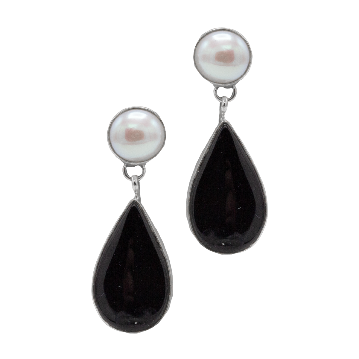 Onyx & Fresh Water Pearl Earrings; 1-1/2″ long.