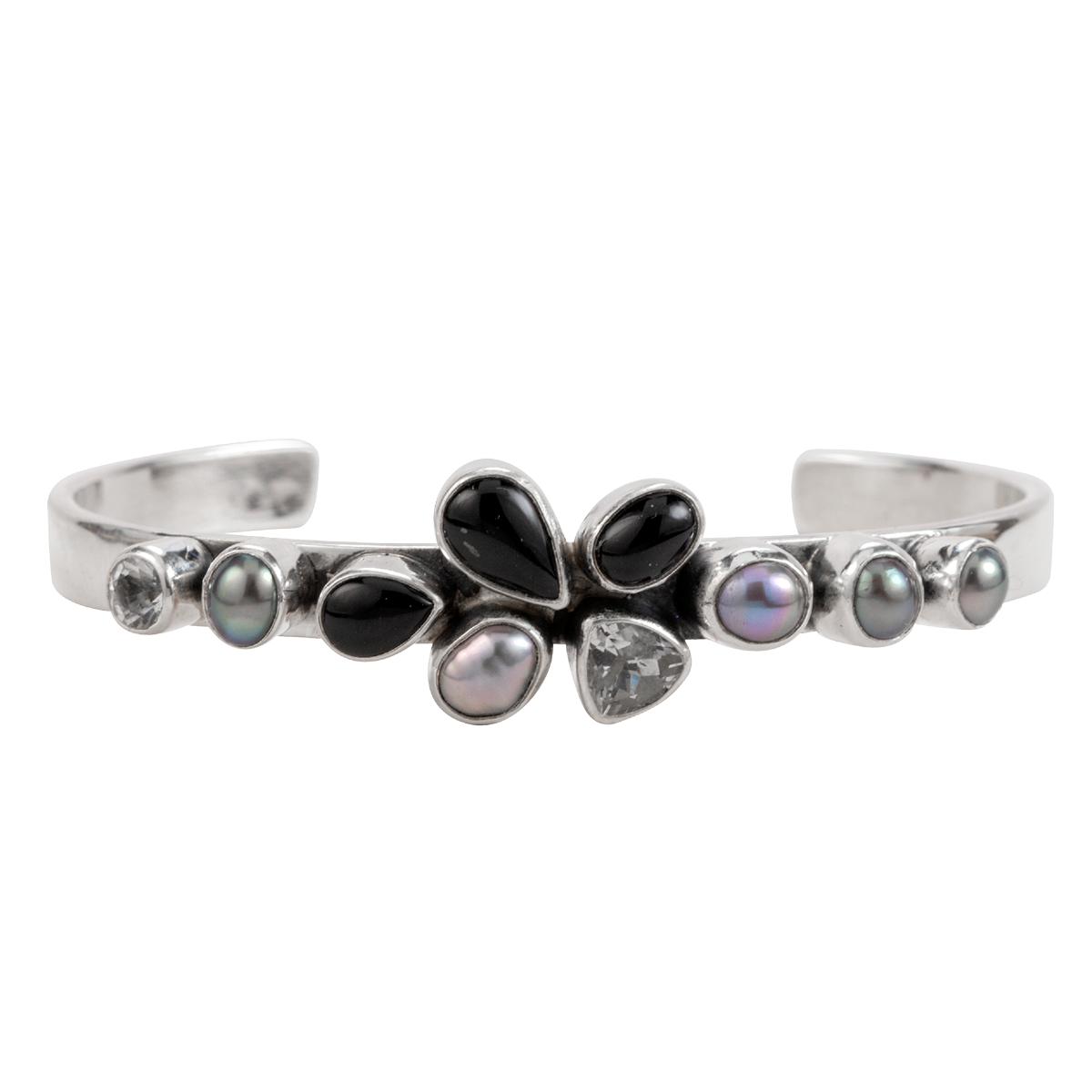 Onyx, White Quartz, and Grey Pearl Cuff Bracelet. 1/2″ at widest point.