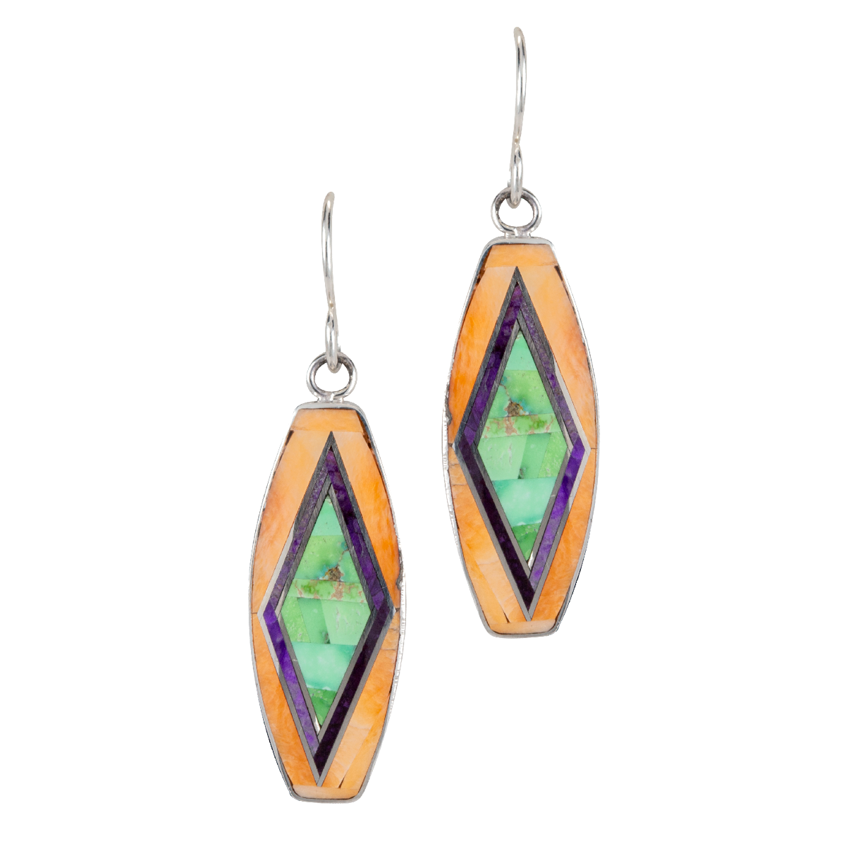 Orange Spiney Oyster Shell, Carico Lake Turquoise, and Sugilite Inlay Earring. 2″ long.