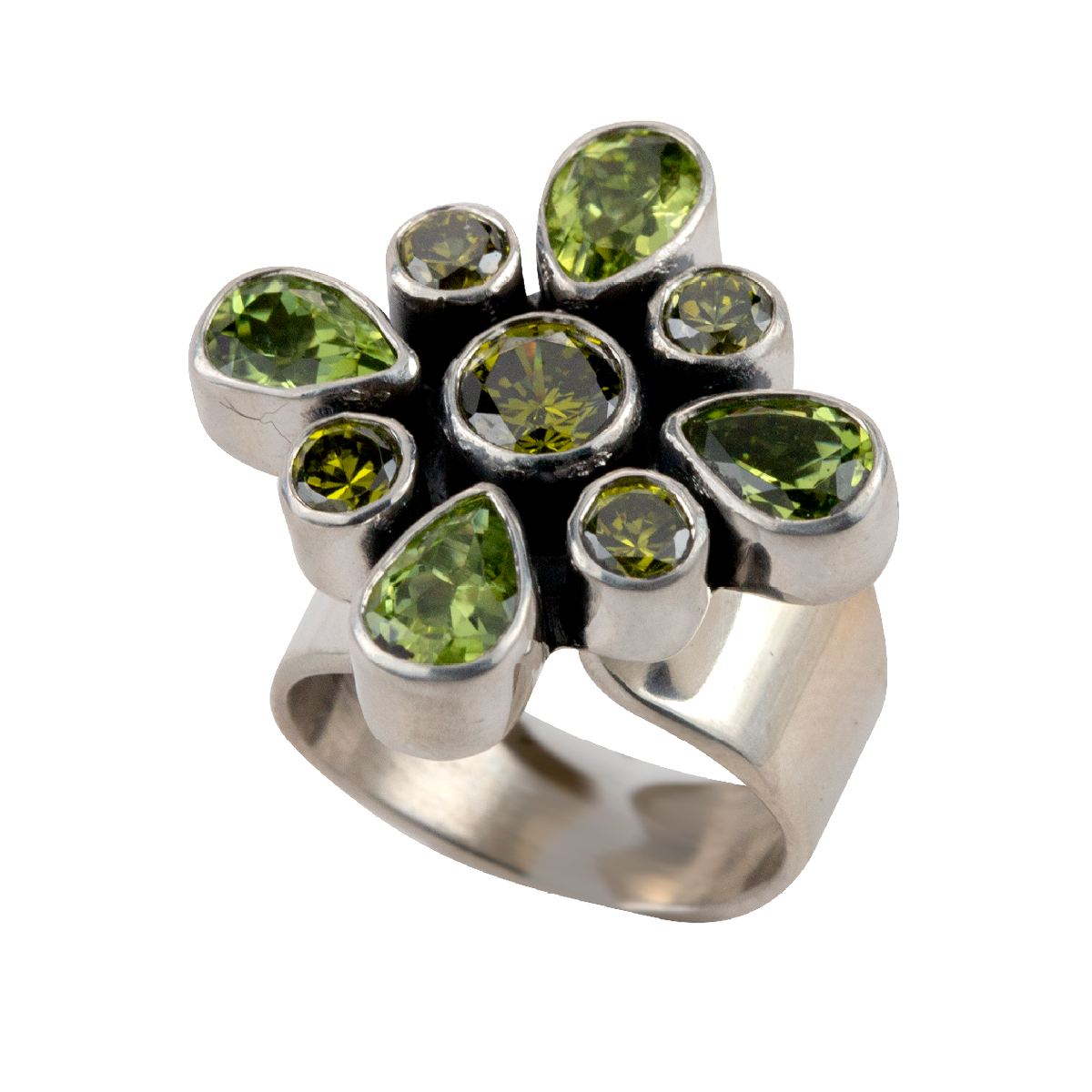 Peridot Cluster Ring. Size 6, Slightly adjustable. 1″ across.