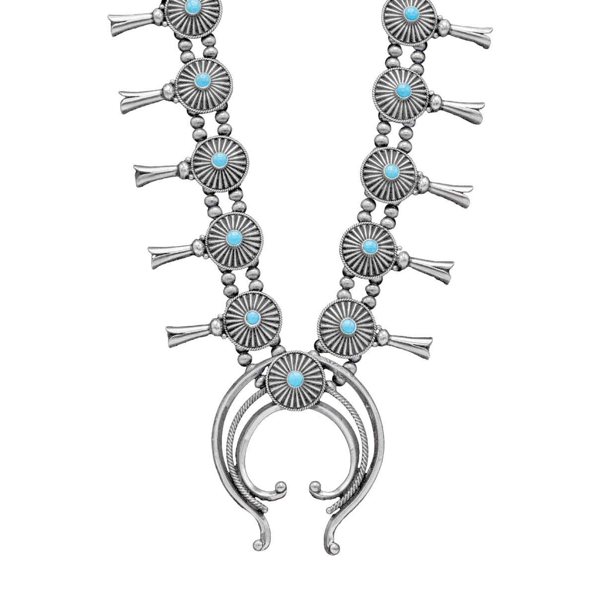 Sleeping Beauty Squash Blossom Necklace & Earring Set; 28″ in length, naja is 3″ long. Matching earrings (not pictured) are 2-1/2″ long.
