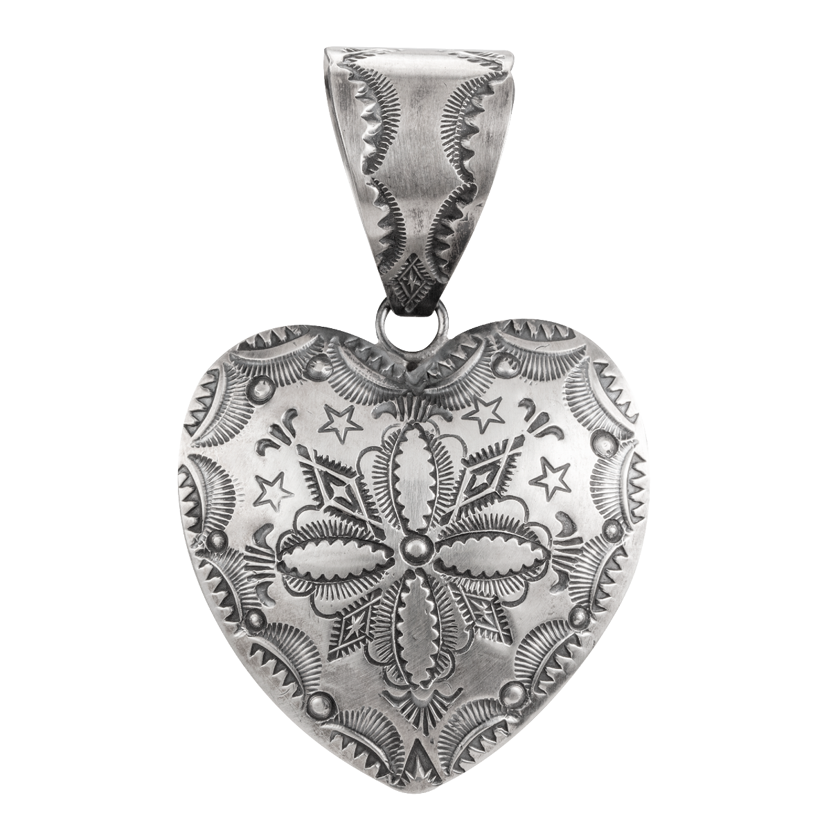 Vincent Platero Stapmed Heart Pendant. 3-1/2″ from top of the bale to the tip of the heart.