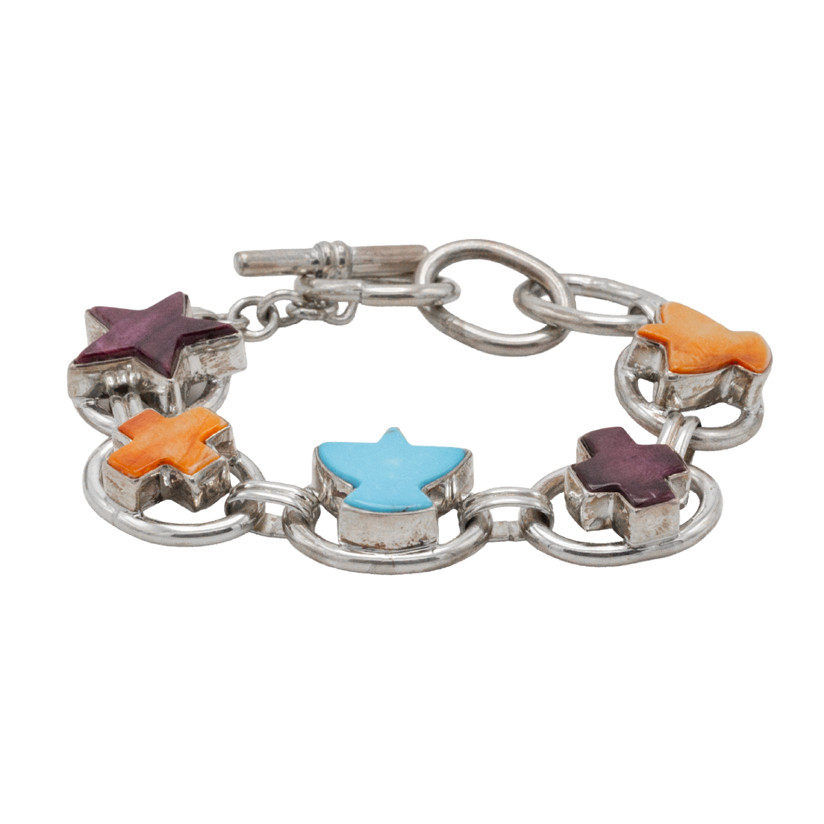 Turquoise and Spiny Oyster Mix Link Bracelet with Star, Cross and Dove Design; total length 8.”