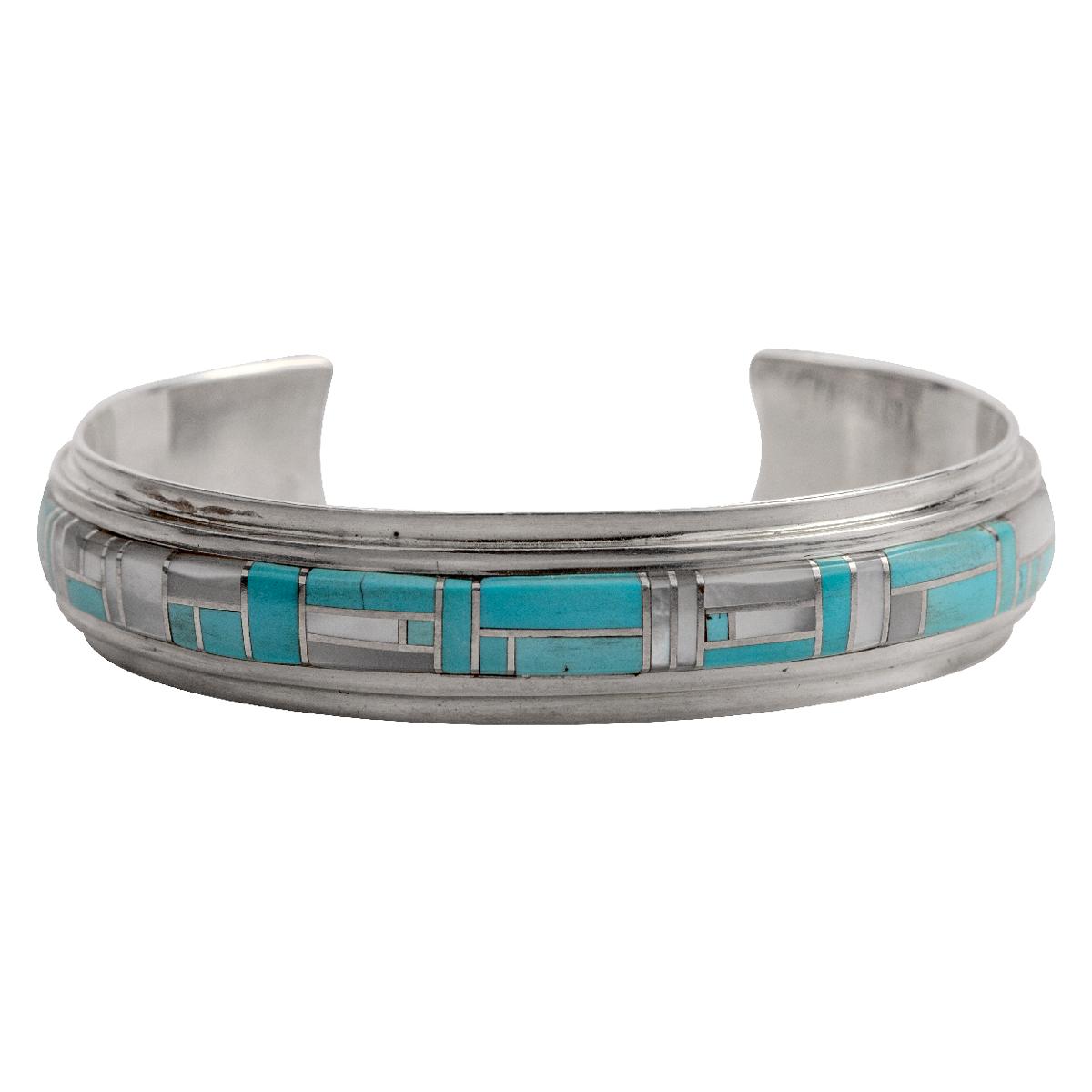 Sleeping Beauty Turquoise and Mother of Pearl Inlay Cuff Bracelet. 1/2″ wide.