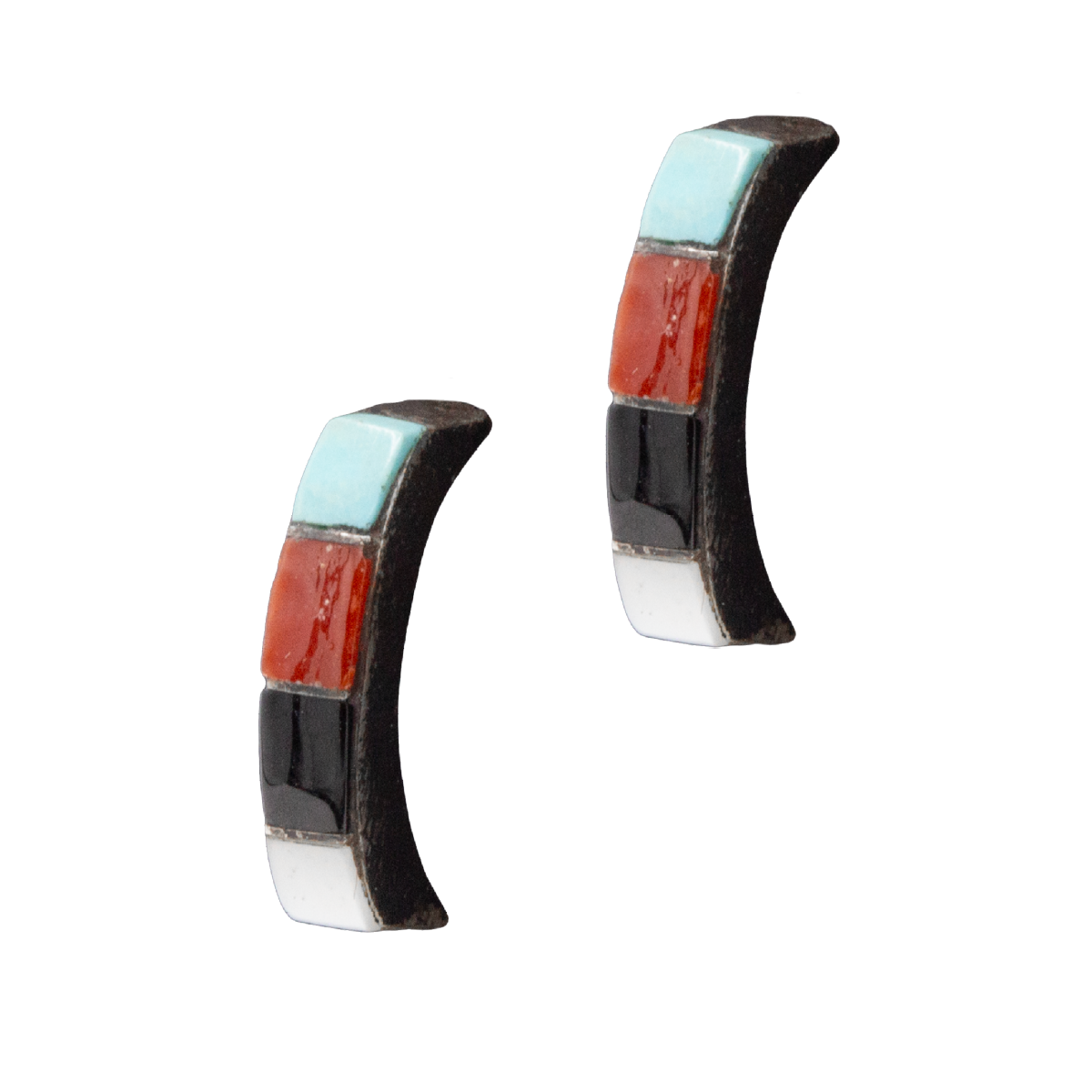 Vintage Inlay Earrings with turquoise, coral, onyx and mother of pearl; 3/4″ long.